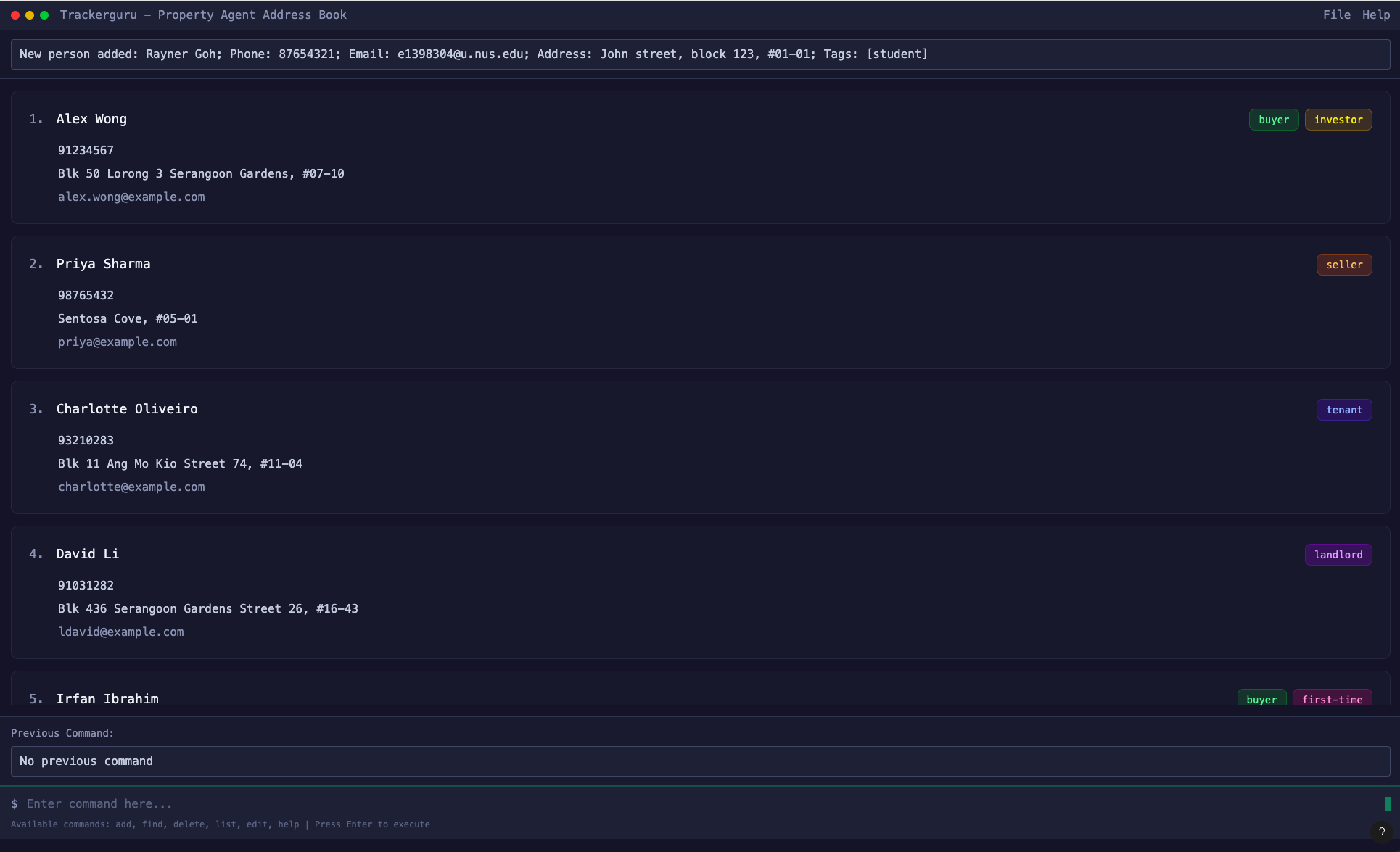 TrackerGuru is a desktop application meant for Property Agents to manage their contact details. While it has a GUI, most of the user interactions happen using a CLI (Command Line Interface). Property agents juggle scattered client and property data across multiple projects. TrackerGuru gives fast typists a lightweight, keyboard-first workspace to instantly add, search, and update contacts with no clutter, no clicks. It provides speed, structure, and focus that lets agents close deals faster.